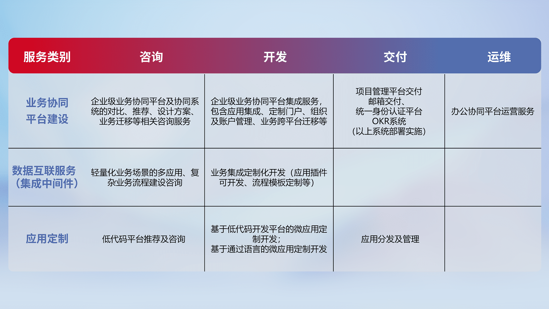 针对钉钉、、、企微、、、、IDaas等平台级产品提供产品的规划、、、方案、、、、交付、、、定制化开发等服务,,,,实现如统一协同办公、、、、智能客户服务、、、混合会议管理、、、、智能数据查询、、、等业务场景,,,,实现数字化转型。。